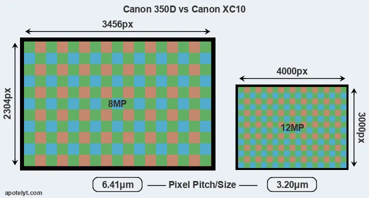 Despite having a smaller sensor, the XC10 offers a higher resolution of 12 megapixels, compared with 8 MP of the 350D. This megapixels advantage comes at the cost of a higher pixel density and a smaller size of the individual pixel (with a pixel pitch of 3.20μm versus 6.41μm for the 350D). However, it should be noted that the XC10 is much more recent (by 10 years and 1 month) than the 350D, and its sensor will have benefitted from technological advances during this time that make it possible to gather light more efficiently.