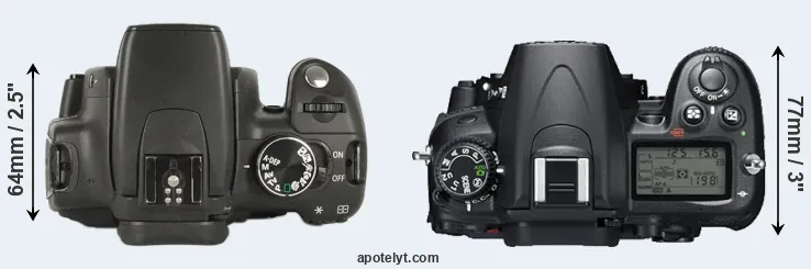 The physical size and weight of the Canon 350D and the Nikon D7000 are illustrated in the side-by-side display below. The two cameras are presented according to their relative size. Three consecutive views from the front, the top, and the rear side are shown. All size dimensions are rounded to the nearest millimeter.