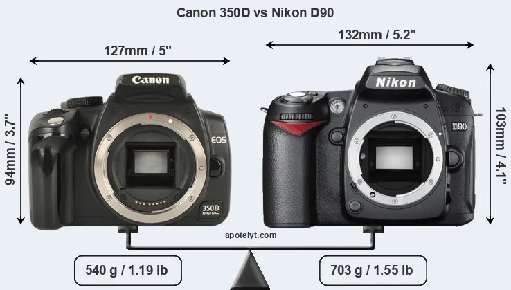 An illustration of the physical size and weight of the Canon 350D and the Nikon D90 is provided in the side-by-side display below. The two cameras are presented according to their relative size. Three successive views from the front, the top, and the rear are shown. All width, height and depth dimensions are rounded to the nearest millimeter.