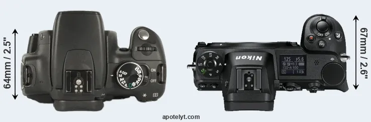 The physical size and weight of the Canon 350D and the Nikon Z6 are illustrated in the side-by-side display below. The two cameras are presented according to their relative size. Three consecutive views from the front, the top, and the rear side are shown. All size dimensions are rounded to the nearest millimeter.