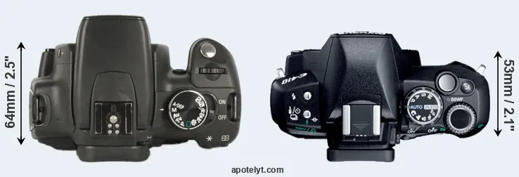 If the front view area (width x height) of the cameras is taken as an aggregate measure of their size, the Canon 350D and the Olympus E-410 are of equal size. However, the E-410 is markedly lighter (19 percent) than the 350D. In this context, it is worth noting that neither the 350D nor the E-410 are weather-sealed.