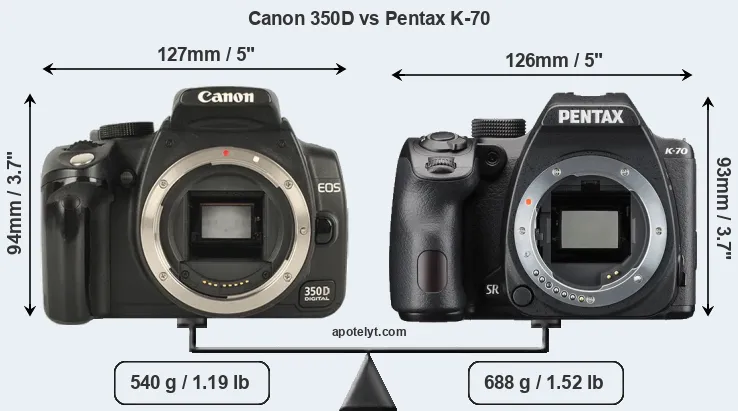 If the front view area (width x height) of the cameras is taken as an aggregate measure of their size, the Pentax K-70 is somewhat smaller (2 percent) than the Canon 350D. However, the K-70 is markedly heavier (27 percent) than the 350D. It is noteworthy in this context that the K-70 is splash and dust-proof, while the 350D does not feature any corresponding weather-sealing.