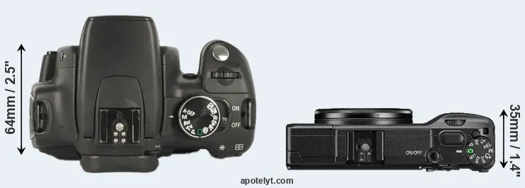 The side-by-side display below illustrates the physical size and weight of the Canon 350D and the Ricoh GR II. The two cameras are presented according to their relative size. Three consecutive perspectives from the front, the top, and the back are available. All width, height and depth measures are rounded to the nearest millimeter.