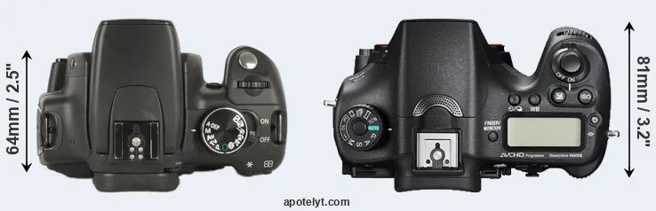 The side-by-side display below illustrates the physical size and weight of the Canon 350D and the Sony A77 II. The two cameras are presented according to their relative size. Three consecutive perspectives from the front, the top, and the back are available. All size dimensions are rounded to the nearest millimeter.