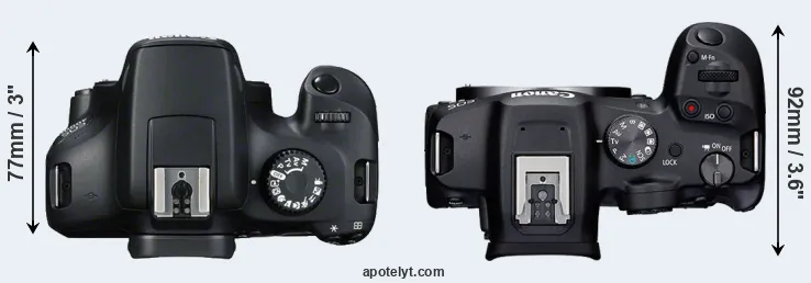 The side-by-side display below illustrates the physical size and weight of the Canon 4000D and the Canon R7. The two cameras are presented according to their relative size. Three consecutive perspectives from the front, the top, and the back are available. All width, height and depth measures are rounded to the nearest millimeter.