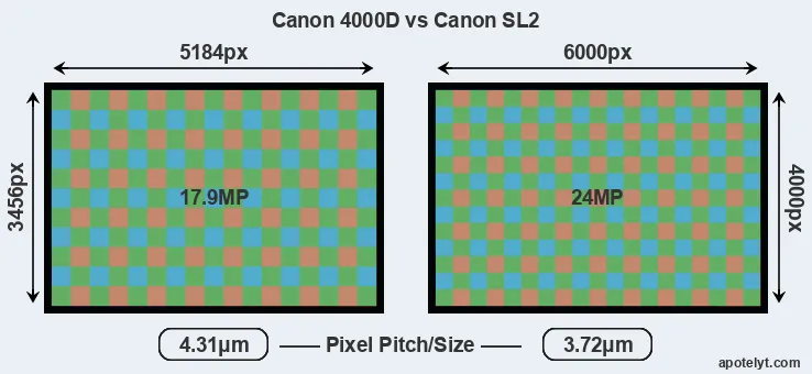 While the two cameras under review share the same sensor size, the SL2 offers a higher resolution of 24 megapixels, compared with 17.9 MP of the 4000D. This megapixels advantage translates into a 16 percent gain in linear resolution. On the other hand, these sensor specs imply that the SL2 has a higher pixel density and a smaller size of the individual pixel (with a pixel pitch of 3.72μm versus 4.31μm for the 4000D). Moreover, it should be noted, that the 4000D is a somewhat more recent model (by 7 months) than the SL2, and its sensor might have benefitted from technological advances during this time that further enhance the light gathering capacity of individual pixels.