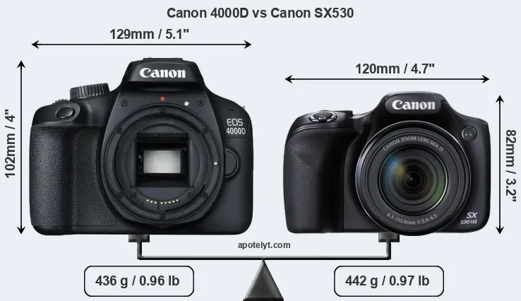 The above size and weight comparisons are to some extent incomplete and possibly misleading, as the SX530 has a lens built in, whereas the 4000D is an interchangeable lens camera that requires a separate lens. Attaching the latter will add extra weight and bulk to the setup. You can compare the optics available for the 4000D and their specifications in the Canon EF Lens Catalog.