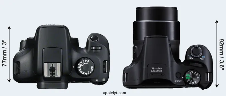 The Canon EOS 4000D (called Canon T100 in some regions) and the Canon PowerShot SX530 HS are two digital cameras that were revealed to the public, respectively, in February 2018 and January 2015. The 4000D is a DSLR, while the SX530 is a fixed lens compact. The cameras are based on an APS-C (4000D) and a 1/2.3-inch (SX530) sensor. The 4000D has a resolution of 17.9 megapixels, whereas the SX530 provides 15.9 MP.