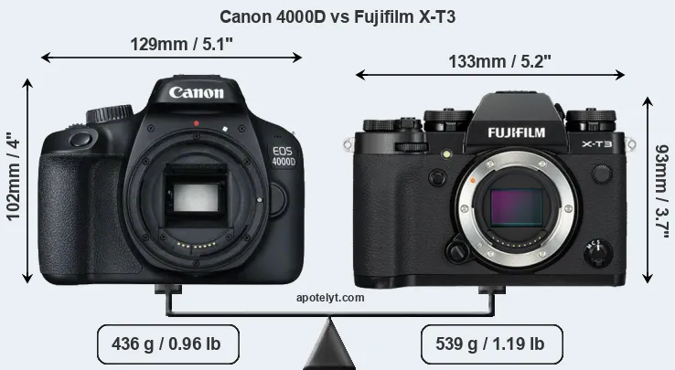 An illustration of the physical size and weight of the Canon 4000D and the Fujifilm X-T3 is provided in the side-by-side display below. The two cameras are presented according to their relative size. Three successive views from the front, the top, and the rear are shown. All width, height and depth measures are rounded to the nearest millimeter.