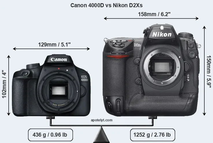 If the front view area (width x height) of the cameras is taken as an aggregate measure of their size, the Nikon D2Xs is considerably larger (80 percent) than the Canon 4000D. Moreover, the D2Xs is substantially heavier (187 percent) than the 4000D. It is noteworthy in this context that the D2Xs is splash and dust-proof, while the 4000D does not feature any corresponding weather-sealing.