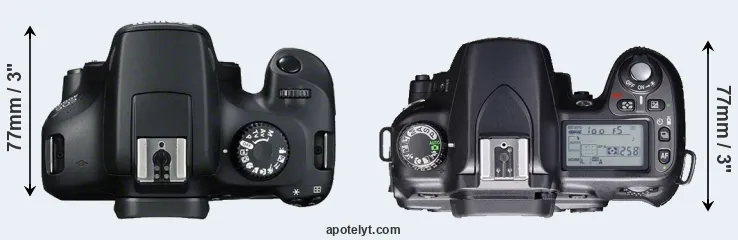 The side-by-side display below illustrates the physical size and weight of the Canon 4000D and the Nikon D80. The two cameras are presented according to their relative size. Three successive views from the front, the top, and the rear are shown. All width, height and depth dimensions are rounded to the nearest millimeter.