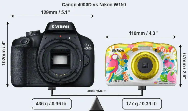 The above size and weight comparisons are to some extent incomplete and possibly misleading, as the W150 has a lens built in, whereas the 4000D is an interchangeable lens camera that requires a separate lens. Attaching the latter will add extra weight and bulk to the setup. You can compare the optics available for the 4000D and their specifications in the Canon EF Lens Catalog.