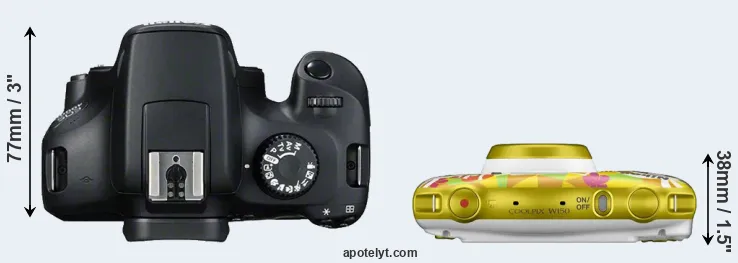 Going beyond this snapshot of core features and characteristics, what are the differences between the Canon EOS 4000D and the Nikon Coolpix W150? Which one should you buy? Read on to find out how these two cameras compare with respect to their body size, their imaging sensors, their shooting features, their input-output connections, and their reception by expert reviewers.