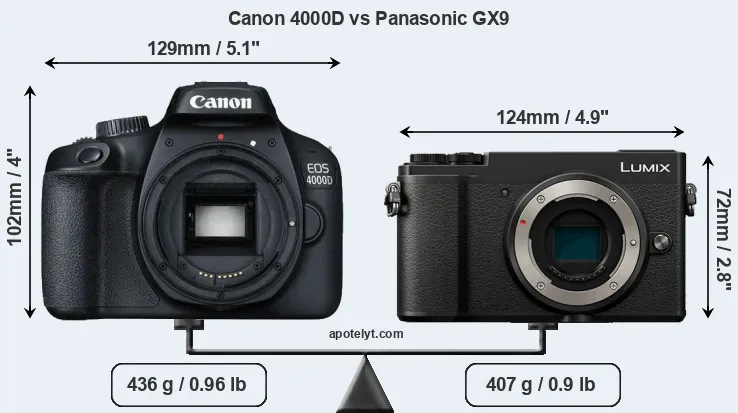 An illustration of the physical size and weight of the Canon 4000D and the Panasonic GX9 is provided in the side-by-side display below. The two cameras are presented according to their relative size. Three consecutive perspectives from the front, the top, and the back are available. All width, height and depth measures are rounded to the nearest millimeter.