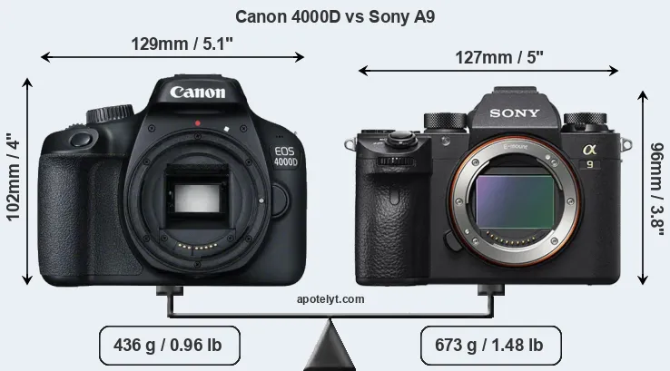 If the front view area (width x height) of the cameras is taken as an aggregate measure of their size, the Sony A9 is notably smaller (7 percent) than the Canon 4000D. However, the A9 is substantially heavier (54 percent) than the 4000D. It is noteworthy in this context that the A9 is splash and dust-proof, while the 4000D does not feature any corresponding weather-sealing.