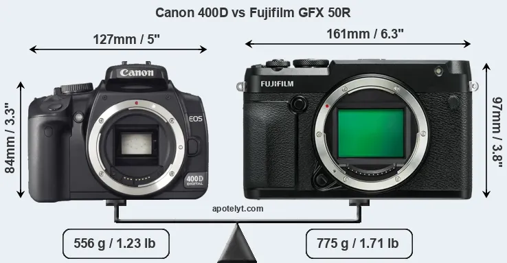 The side-by-side display below illustrates the physical size and weight of the Canon 400D and the Fujifilm GFX 50R. The two cameras are presented according to their relative size. Three consecutive perspectives from the front, the top, and the back are available. All width, height and depth dimensions are rounded to the nearest millimeter.