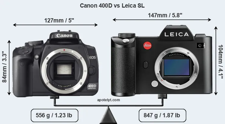 If the front view area (width x height) of the cameras is taken as an aggregate measure of their size, the Leica SL is considerably larger (43 percent) than the Canon 400D. Moreover, the Leica SL is substantially heavier (52 percent) than the 400D. It is noteworthy in this context that the Leica SL is splash and dust-proof, while the 400D does not feature any corresponding weather-sealing.