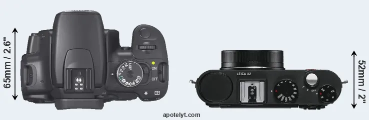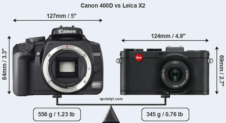 The side-by-side display below illustrates the physical size and weight of the Canon 400D and the Leica X2. The two cameras are presented according to their relative size. Three consecutive perspectives from the front, the top, and the back are available. All width, height and depth measures are rounded to the nearest millimeter.