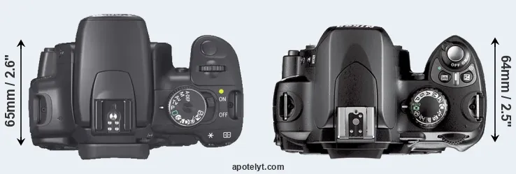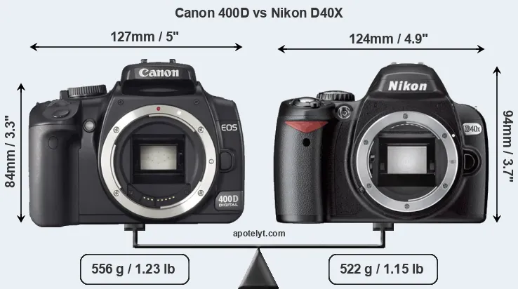 The side-by-side display below illustrates the physical size and weight of the Canon 400D and the Nikon D40X. The two cameras are presented according to their relative size. Three consecutive views from the front, the top, and the rear side are shown. All width, height and depth dimensions are rounded to the nearest millimeter.