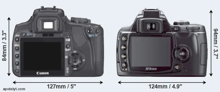 The above size and weight comparisons are to some extent incomplete since they do not consider the interchangeable lenses that both of these cameras require. Yet, since both cameras are based around an APS-C sensor, their respective lenses will tend to have similar dimensions and heft. You can compare the optics available for the two cameras in the Canon EF Lens Catalog (400D) and the Nikon Lens Catalog (D40X).