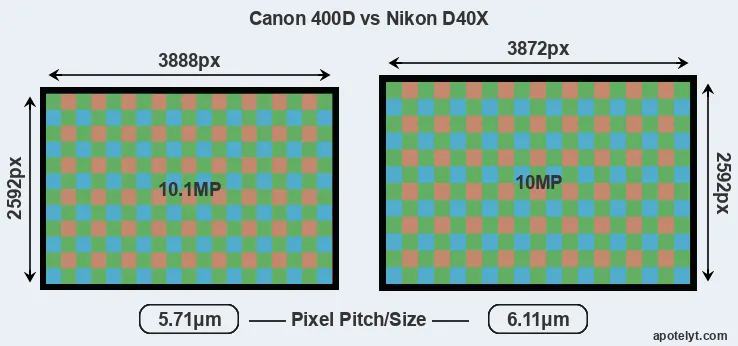 Despite having a smaller sensor, the Canon 400D offers a higher resolution of 10.1 megapixels, compared with 10 MP of the Nikon D40X. This megapixels advantage comes at the cost of a higher pixel density and a smaller size of the individual pixel (with a pixel pitch of 5.71μm versus 6.11μm for the D40X). Moreover, it should be noted that the D40X is a somewhat more recent model (by 6 months) than the 400D, and its sensor might have benefitted from technological advances during this time that further enhance the light gathering capacity of its pixel-units.