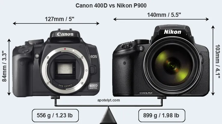 The side-by-side display below illustrates the physical size and weight of the Canon 400D and the Nikon P900. The two cameras are presented according to their relative size. Three consecutive views from the front, the top, and the rear side are shown. All width, height and depth dimensions are rounded to the nearest millimeter.