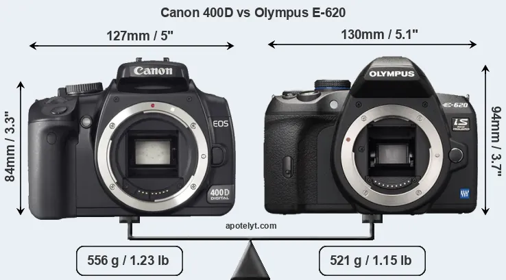 If the front view area (width x height) of the cameras is taken as an aggregate measure of their size, the Olympus E-620 is notably larger (15 percent) than the Canon 400D. However, the E-620 is markedly lighter (6 percent) than the 400D. In this context, it is worth noting that neither the 400D nor the E-620 are weather-sealed.