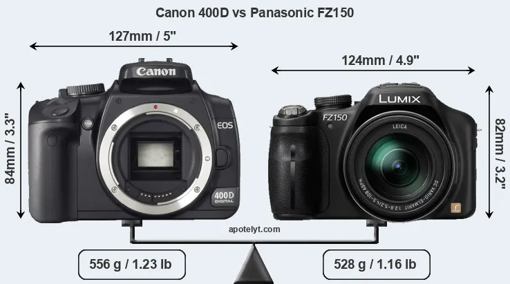 The above size and weight comparisons are to some extent incomplete and possibly misleading, as the FZ150 has a lens built in, whereas the 400D is an interchangeable lens camera that requires a separate lens. Attaching the latter will add extra weight and bulk to the setup. You can compare the optics available for the 400D and their specifications in the Canon EF Lens Catalog.