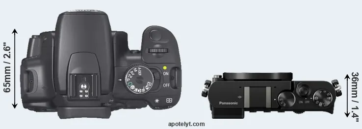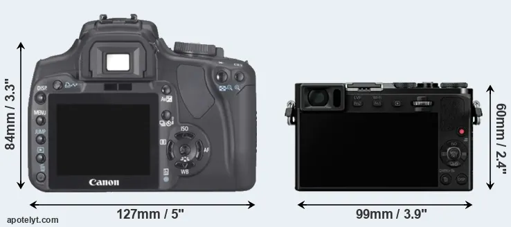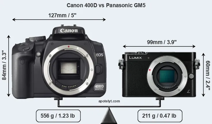 The side-by-side display below illustrates the physical size and weight of the Canon 400D and the Panasonic GM5. The two cameras are presented according to their relative size. Three consecutive perspectives from the front, the top, and the back are available. All width, height and depth measures are rounded to the nearest millimeter.
