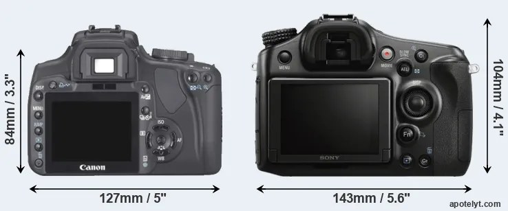 Going beyond this snapshot of core features and characteristics, what are the differences between the Canon EOS 400D and the Sony Alpha SLT-A68? Which one should you buy? Read on to find out how these two cameras compare with respect to their body size, their imaging sensors, their shooting features, their input-output connections, and their reception by expert reviewers.