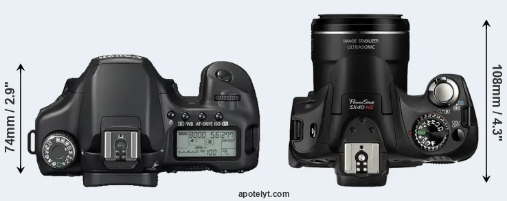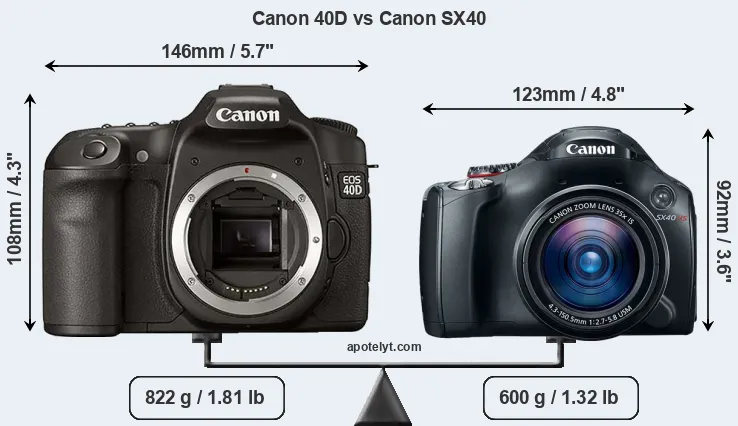 An illustration of the physical size and weight of the Canon 40D and the Canon SX40 is provided in the side-by-side display below. The two cameras are presented according to their relative size. Three consecutive perspectives from the front, the top, and the back are available. All size dimensions are rounded to the nearest millimeter.