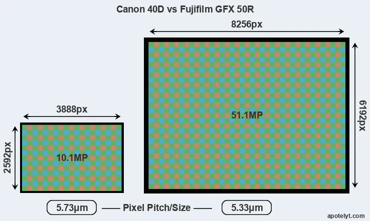 | Sensor Specs | Canon 40D | Fujifilm GFX 50R |