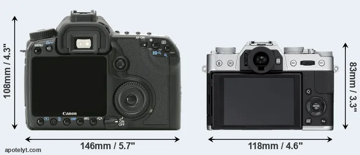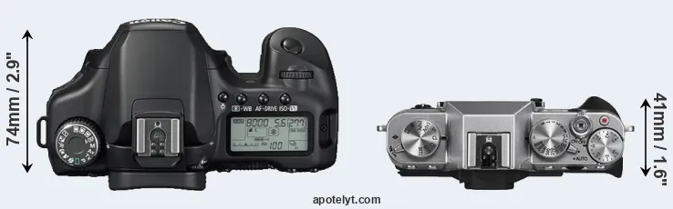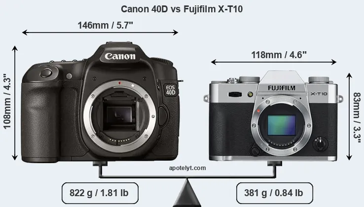 The physical size and weight of the Canon 40D and the Fujifilm X-T10 are illustrated in the side-by-side display below. The two cameras are presented according to their relative size. Three consecutive perspectives from the front, the top, and the back are available. All width, height and depth dimensions are rounded to the nearest millimeter.