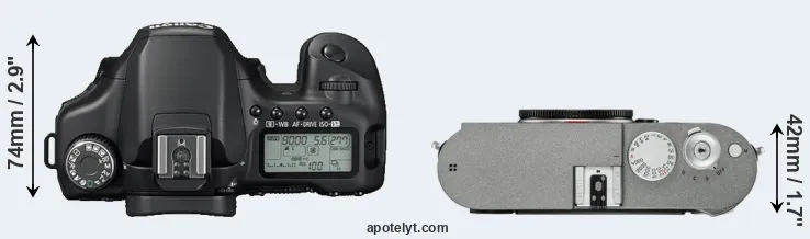 The side-by-side display below illustrates the physical size and weight of the Canon 40D and the Leica M-E Typ 240. The two cameras are presented according to their relative size. Three consecutive views from the front, the top, and the rear side are shown. All width, height and depth dimensions are rounded to the nearest millimeter.