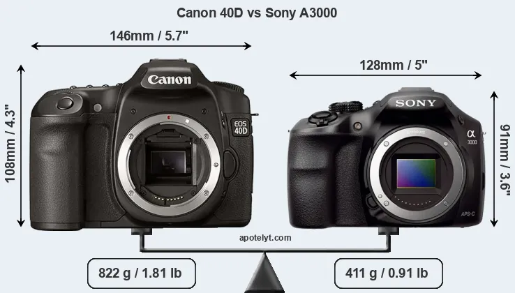 The physical size and weight of the Canon 40D and the Sony A3000 are illustrated in the side-by-side display below. The two cameras are presented according to their relative size. Three consecutive perspectives from the front, the top, and the back are available. All width, height and depth measures are rounded to the nearest millimeter.