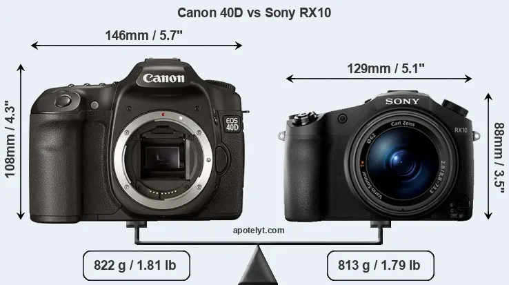 The above size and weight comparisons are to some extent incomplete and possibly misleading, as the RX10 has a lens built in, whereas the 40D is an interchangeable lens camera that requires a separate lens. Attaching the latter will add extra weight and bulk to the setup. You can compare the optics available for the 40D and their specifications in the Canon EF Lens Catalog.