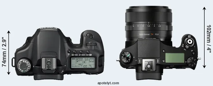 The side-by-side display below illustrates the physical size and weight of the Canon 40D and the Sony RX10. The two cameras are presented according to their relative size. Three consecutive perspectives from the front, the top, and the back are available. All width, height and depth dimensions are rounded to the nearest millimeter.