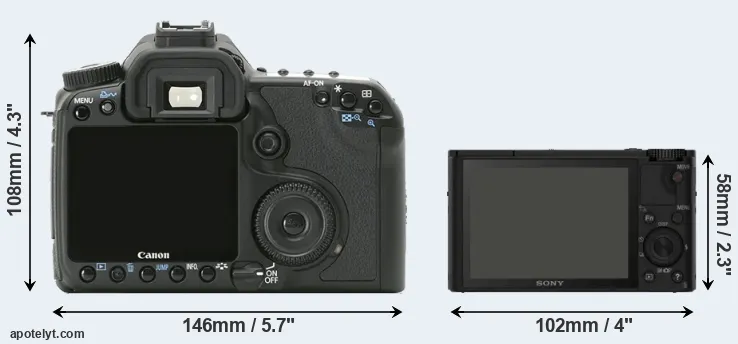The physical size and weight of the Canon 40D and the Sony RX100 are illustrated in the side-by-side display below. The two cameras are presented according to their relative size. Three consecutive views from the front, the top, and the rear side are shown. All size dimensions are rounded to the nearest millimeter.