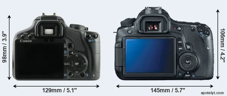 The side-by-side display below illustrates the physical size and weight of the Canon 450D and the Canon 60D. The two cameras are presented according to their relative size. Three consecutive perspectives from the front, the top, and the back are available. All width, height and depth measures are rounded to the nearest millimeter.