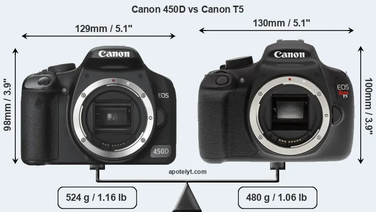The Canon EOS 450D (called Canon XSi in some regions) and the Canon EOS Rebel T5 (labelled Canon 1200D in some countries) are two digital cameras that were officially introduced, respectively, in January 2008 and February 2014. Both are DSLR (Digital Single Lens Reflex) cameras that are equipped with an APS-C sensor. The 450D has a resolution of 12.2 megapixels, whereas the T5 provides 17.9 MP.