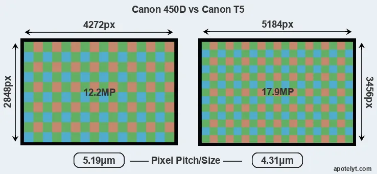 With 17.9MP, the T5 offers a higher resolution than the 450D (12.2MP), but the T5 has smaller individual pixels (pixel pitch of 4.31μm versus 5.19μm for the 450D). Yet, the T5 is a much more recent model (by 6 years) than the 450D, and its sensor will have benefitted from technological advances during this time that enhance the light gathering capacity of its pixel-units.