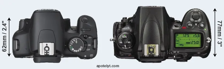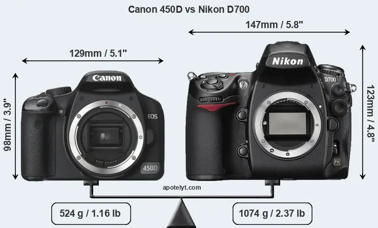The side-by-side display below illustrates the physical size and weight of the Canon 450D and the Nikon D700. The two cameras are presented according to their relative size. Three consecutive perspectives from the front, the top, and the back are available. All size dimensions are rounded to the nearest millimeter.