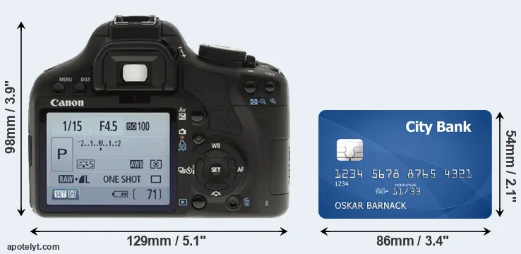 The side-by-side display below illustrates the physical size of the Canon 500D vis-à-vis a credit card. Three successive views from the front, the top, and the rear are shown. All width, height and depth measures are rounded to the nearest millimeter.