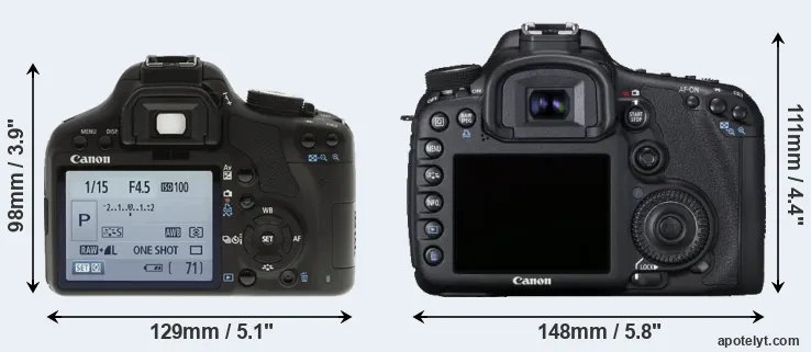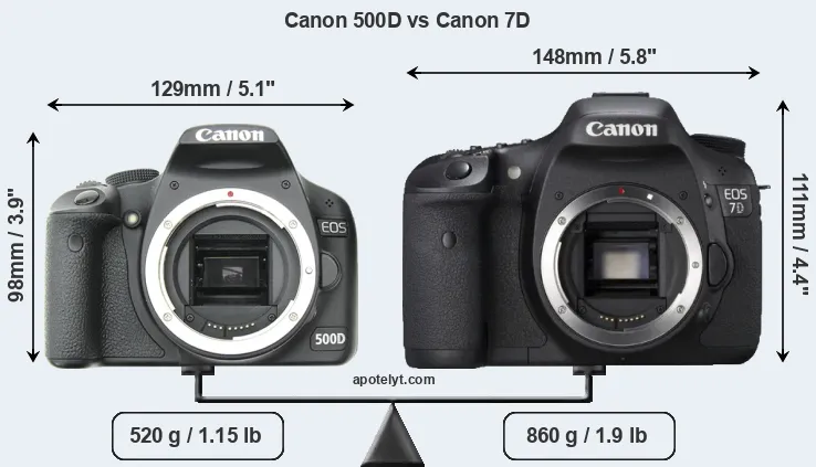 The physical size and weight of the Canon 500D and the Canon 7D are illustrated in the side-by-side display below. The two cameras are presented according to their relative size. Three consecutive views from the front, the top, and the rear side are shown. All width, height and depth measures are rounded to the nearest millimeter.