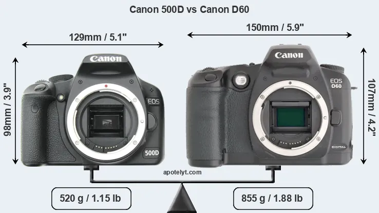 If the front view area (width x height) of the cameras is taken as an aggregate measure of their size, the Canon D60 is notably larger (27 percent) than the Canon 500D. Moreover, the D60 is substantially heavier (64 percent) than the 500D. In this context, it is worth noting that neither the 500D nor the D60 are weather-sealed.