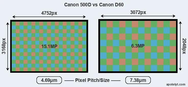 Despite having a slightly smaller sensor, the Canon 500D offers a higher resolution of 15.1 megapixels, compared with 6.3 MP of the Canon D60. This megapixels advantage comes at the cost of a higher pixel density and a smaller size of the individual pixel (with a pixel pitch of 4.69μm versus 7.38μm for the D60). However, it should be noted that the 500D is much more recent (by 7 years and 1 month) than the D60, and its sensor will have benefitted from technological advances during this time that make it possible to gather light more efficiently.