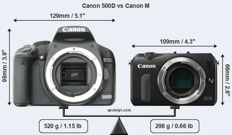 If the front view area (width x height) of the cameras is taken as an aggregate measure of their size, the Canon M is considerably smaller (43 percent) than the Canon 500D. Moreover, the Canon M is substantially lighter (43 percent) than the 500D. In this context, it is worth noting that neither the 500D nor the Canon M are weather-sealed.