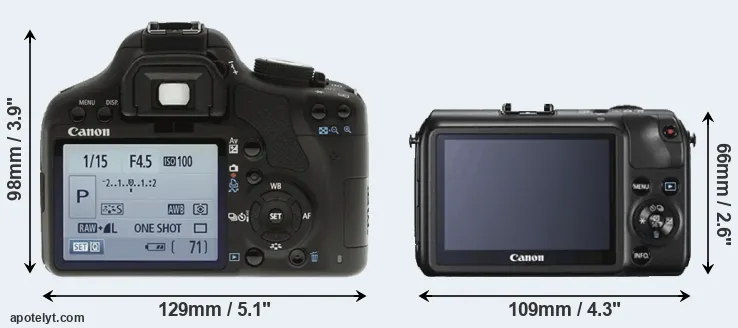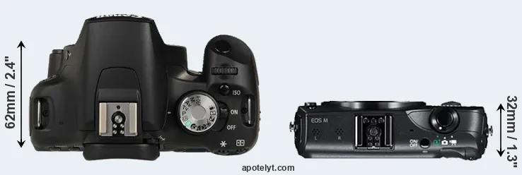 The physical size and weight of the Canon 500D and the Canon M are illustrated in the side-by-side display below. The two cameras are presented according to their relative size. Three consecutive views from the front, the top, and the rear side are shown. All size dimensions are rounded to the nearest millimeter.