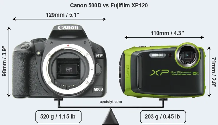 The physical size and weight of the Canon 500D and the Fujifilm XP120 are illustrated in the side-by-side display below. The two cameras are presented according to their relative size. Three successive views from the front, the top, and the rear are shown. All size dimensions are rounded to the nearest millimeter.