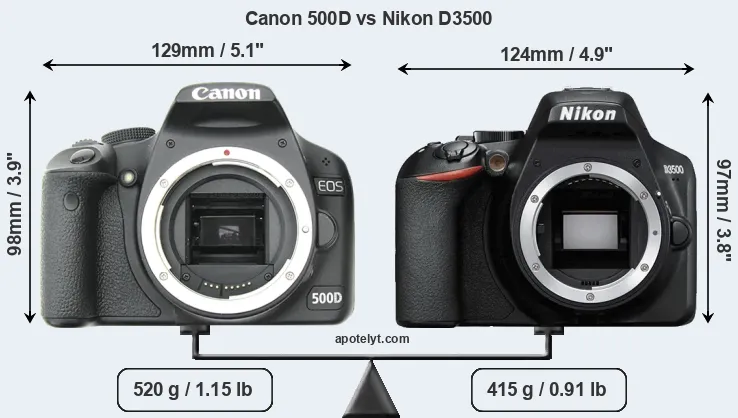 The physical size and weight of the Canon 500D and the Nikon D3500 are illustrated in the side-by-side display below. The two cameras are presented according to their relative size. Three consecutive perspectives from the front, the top, and the back are available. All width, height and depth dimensions are rounded to the nearest millimeter.